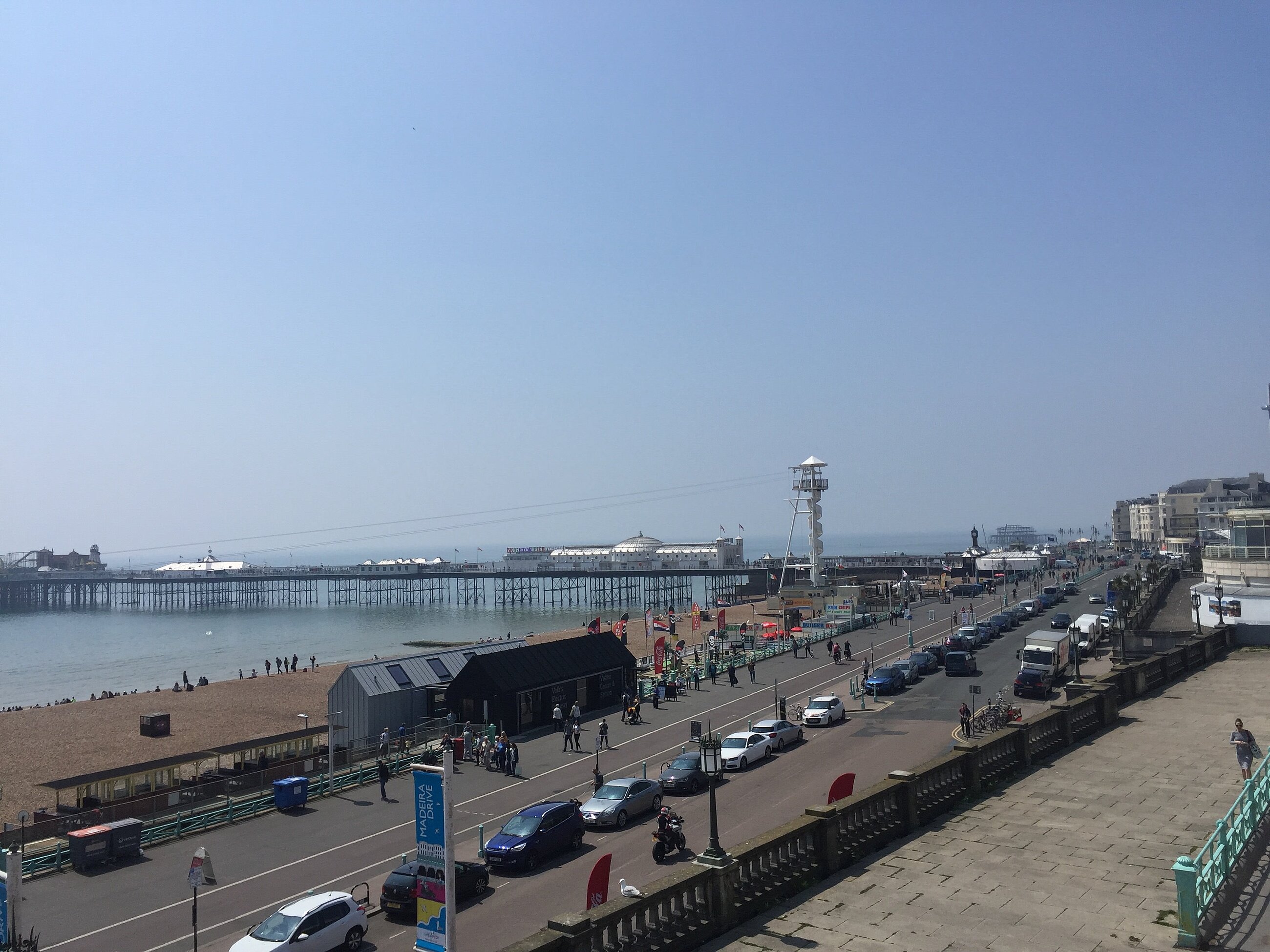 Das Wetter ist gar nicht „typisch englisch“. Es ist aber typisch für Brighton. Wir haben viel Sonne, angenehme Temperaturen und nur einen Nachmittag mal richtig Regen. Deshalb ist am ersten Nachmittag nach der Schule auch der Strand das Ziel der Wahl. Badeanzug und – hose, Badeschuhe und Badehandtuch ist alles, was ein toller Strandnachmittag braucht. Natürlich darf das obligatorische Eis nicht fehlen. An Buden dafür und für Fish & Chips, Kaffee, Kaltgetränke fehlt es am Strand nicht.